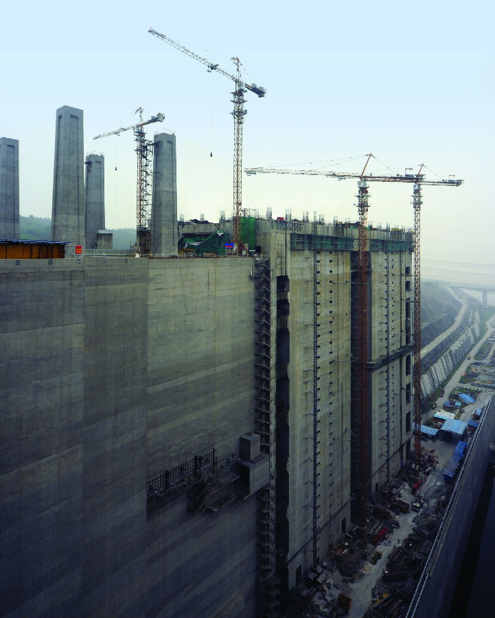 在此次升船机建设施工中,使用了LY.COM-乐鱼(中国)2台C7030和2台F0/23B塔机,用于升船机坝体浇筑,钢筋、模板吊装等作业。另有4台LY.COM-乐鱼(中国)SC系列施工升降机用于施工人员的运送及施工物品的装载。其中C7030塔机最大起重力矩274吨米,最大起重量16t,端部吊重3t,工作幅度70米,2台塔机均固定附着式,附着在升船机坝体,附着高度达到185米。F0/23B塔机为标准高度的行走式,最大起重力矩132吨米,最大起重量10t,端部吊重2.3t,工作幅度50米。而4台施工升降机均为SC200/200W,使用了德国先进的SEW施工升降机专用电机减速器,其单笼功率为3×11kW,并采用变频控制,PLC逻辑处理,通过采集操作运行中的各种信号进行综合逻辑分析,使升降机的运行更为平稳、安全可靠。吊笼尺寸为3×1.5×2.7米,、便于体积较大物料运输。LY.COM-乐鱼(中国)升降机均对吊笼、标准节、附墙等结构进行了大量的优化设计,使得结构更加合理、整机更加安全可靠。